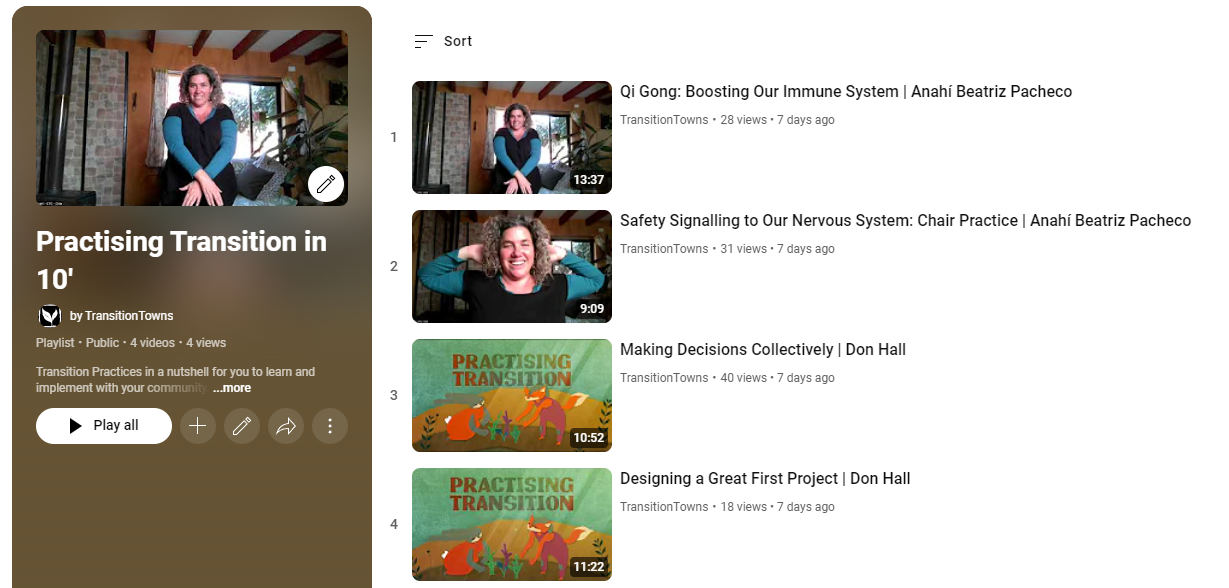 Some folks tend to be pretty busy and feel the need for shorter and easier to digest content. That's why we've launched Practising Transition in 10 minutes, a series of up to 10 minutes videos focused on very practical and specific practices of change. Don Hall and Anahí Beatriz Pacheco have already shared their videos. Have a look at the playlist: