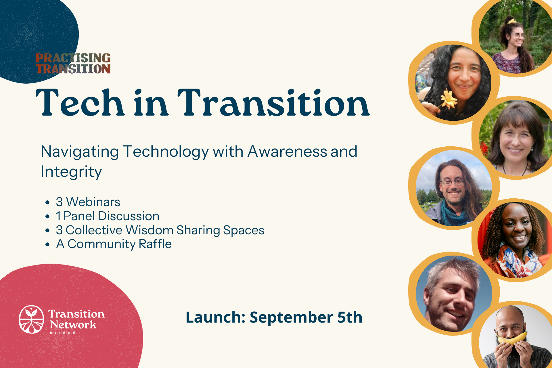 This is the intention behind Tech in Transition, a free, curated, series of webinars and interactive spaces designed to help us explore how to harness the power of technology in service of well-being, justice, and connection.